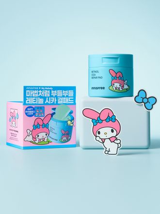 각질과 피지, 결 정돈과 모공, 진정케어까지 패드 1장으로 시작하는 깐달걀 피부결! 피부를 차분하게 진정시켜주고 피부 보습까지 챙겨주는 이니스프리 레티놀 시카 흔적 패드 마이멜로디 에디션
